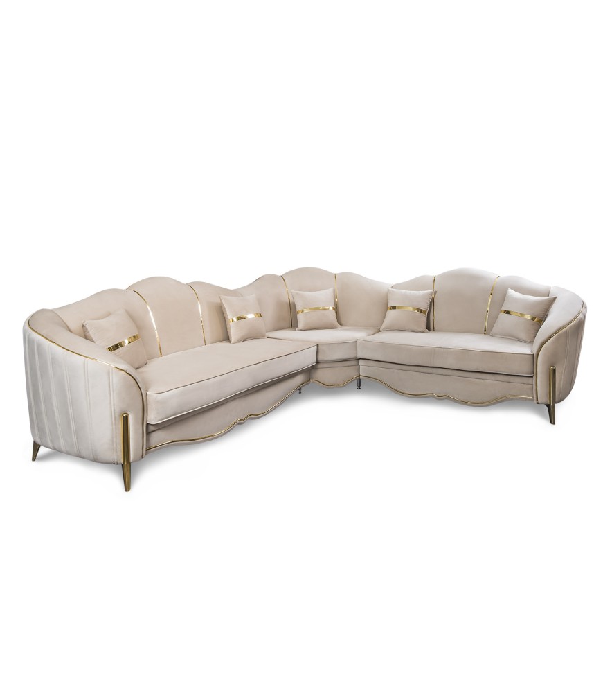 Հարմարավետ և նրբագեղ անկյունային բազմոց 3+2 «Լարան»՝ բացվող մեխանիզմով և ոսկե դեկորով