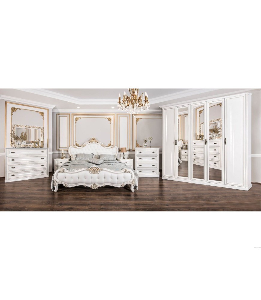 Նրբաճաշակ ննջասենյակի հավաքածու՝ սպիտակ երանգով, 3 դռնանի պահարան հայելով, ՊՊՈւ հայելիով և նեղ կոմոդով