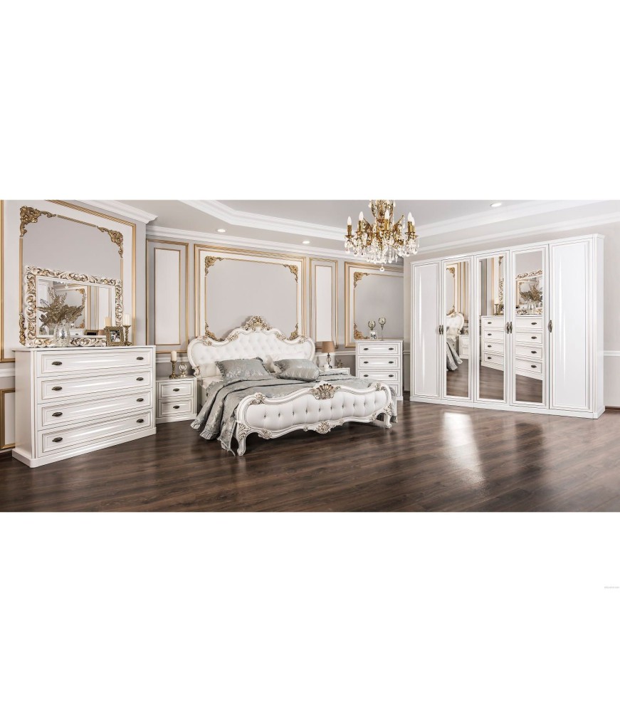 Սպիտակ ննջասենյակի հավաքածու՝ 5 դռնանի պահարանով, ՊՊՈւ հայելիներով և նեղ կոմոդով, չափս՝ 180×200